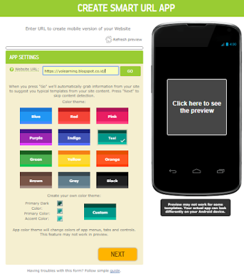 3. Setelah itu akan tampil di menu “APP SETTINGS”, isikan URL website kita yang akan dibuat untuk menjadi apk dan pilih warna tema sesuai keinginan kita, lalu klik “NEXT”.