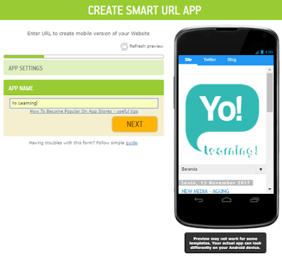 Sebelum pembuatan aplikasi penampil website kita harus terlebih dahulu membuat websitenya. Berikut website yang sudah kami buat https://yolearning.blogspot.co.id/.
